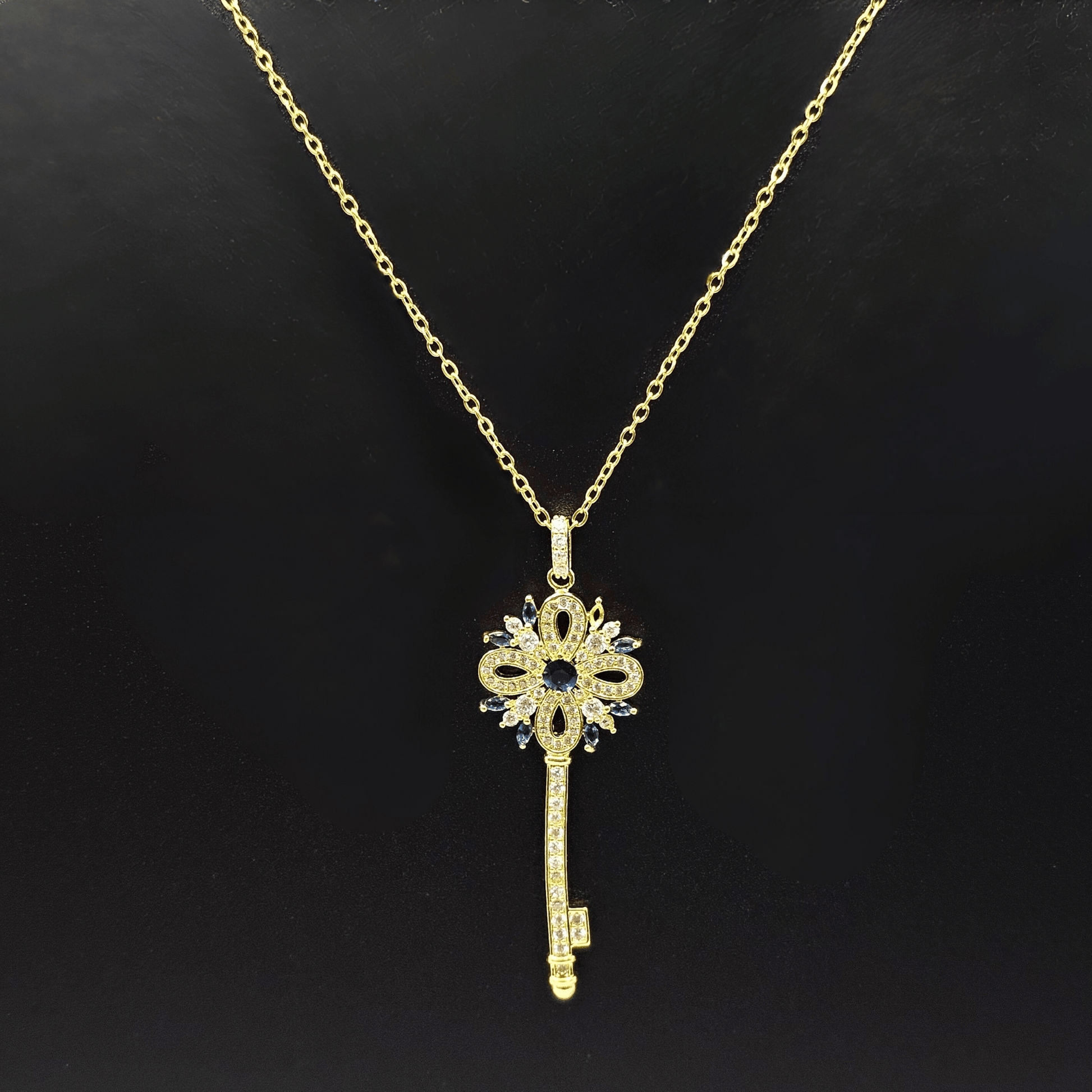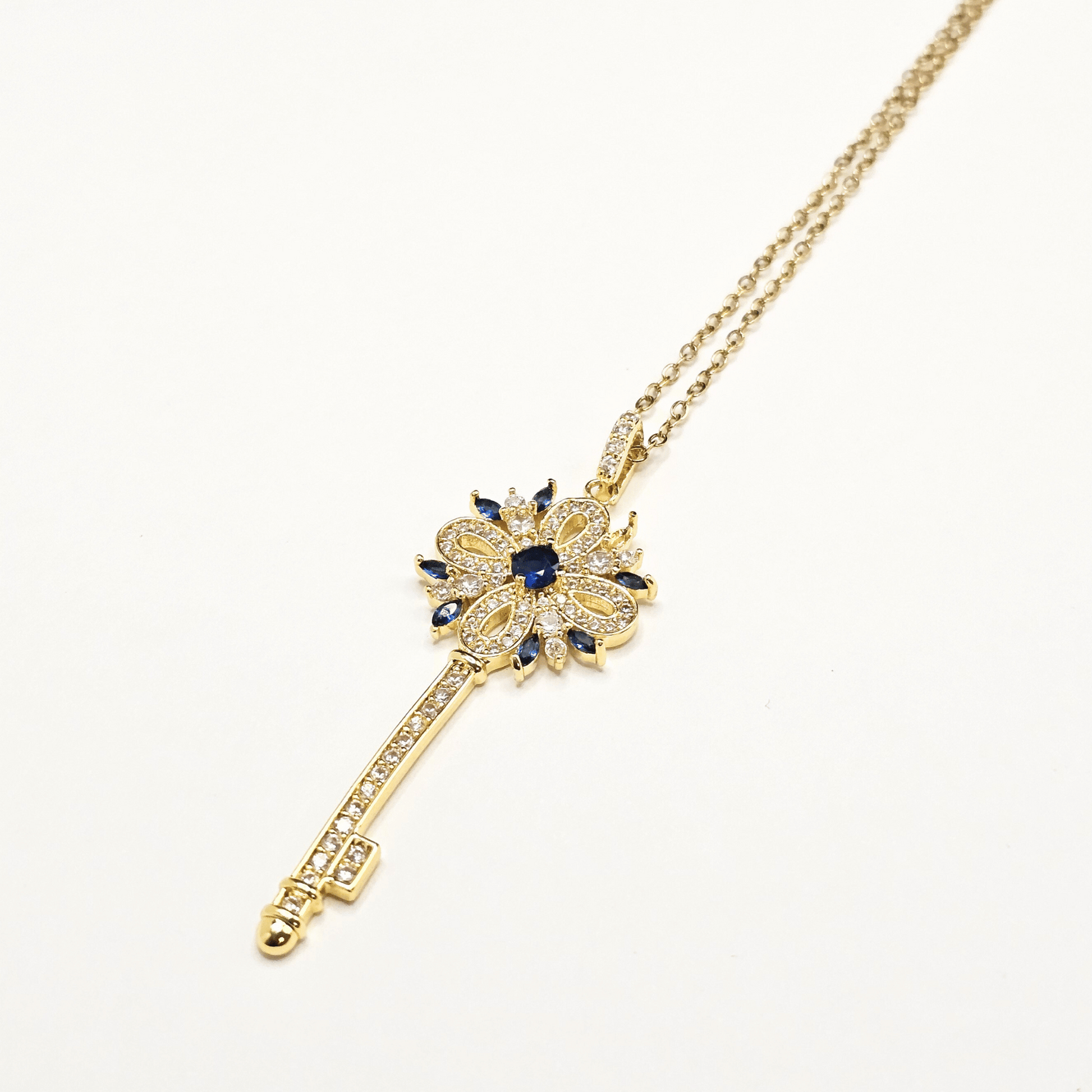 Unlock refined glamour with the Celestia Key Pendant Necklace from our Luxe Collection. An ornate key silhouette meets a radiant floral crown, accented with sapphire-blue stones and a halo of brilliant pavé sparkle. Finished in luminous 18k gold, it’s the statement that still feels effortlessly wearable—elegant for evening, polished for every day.