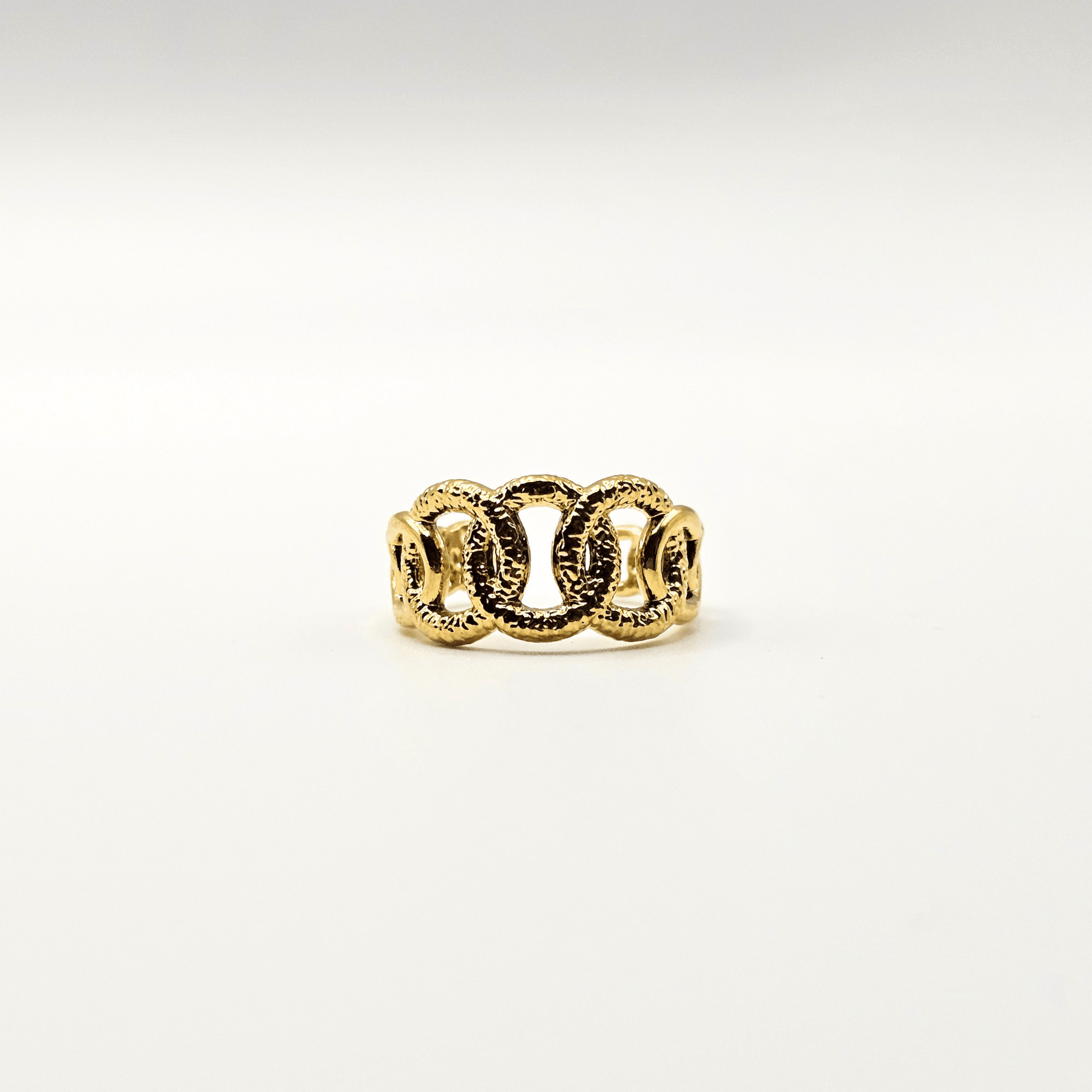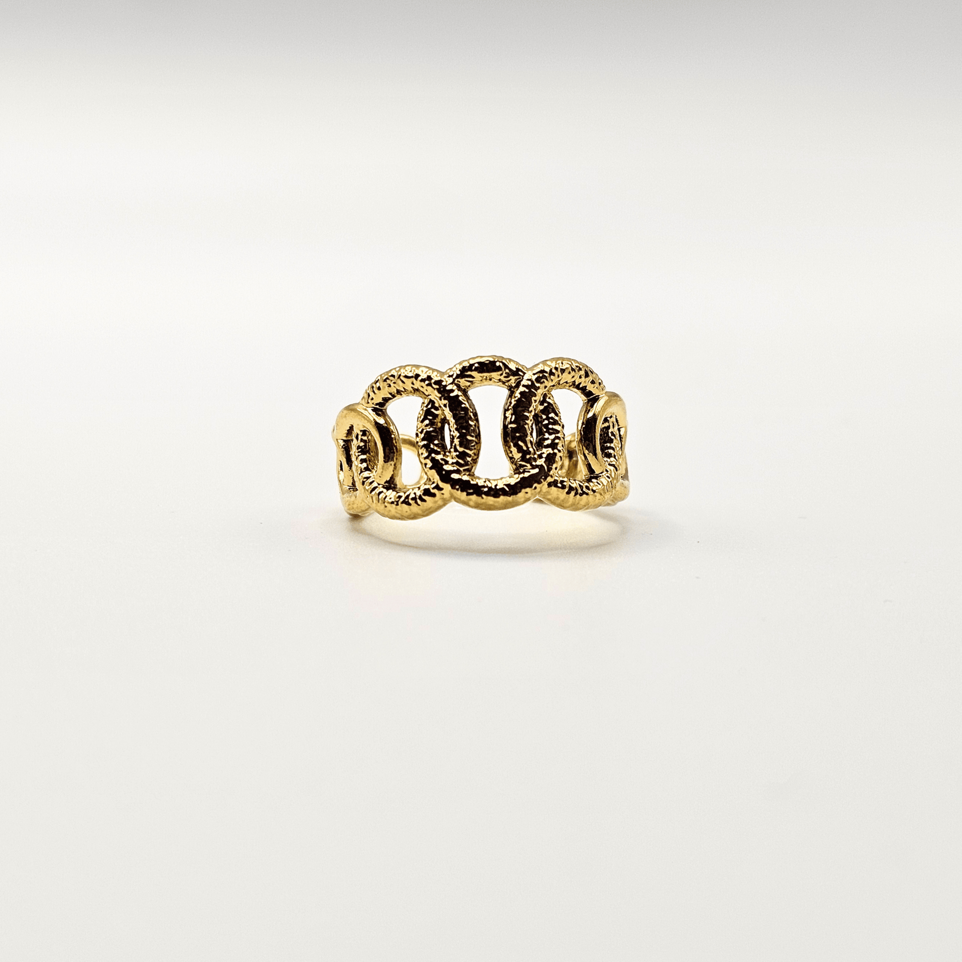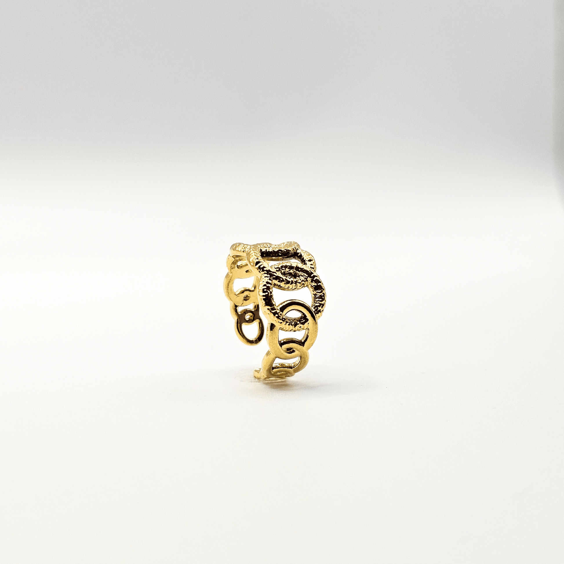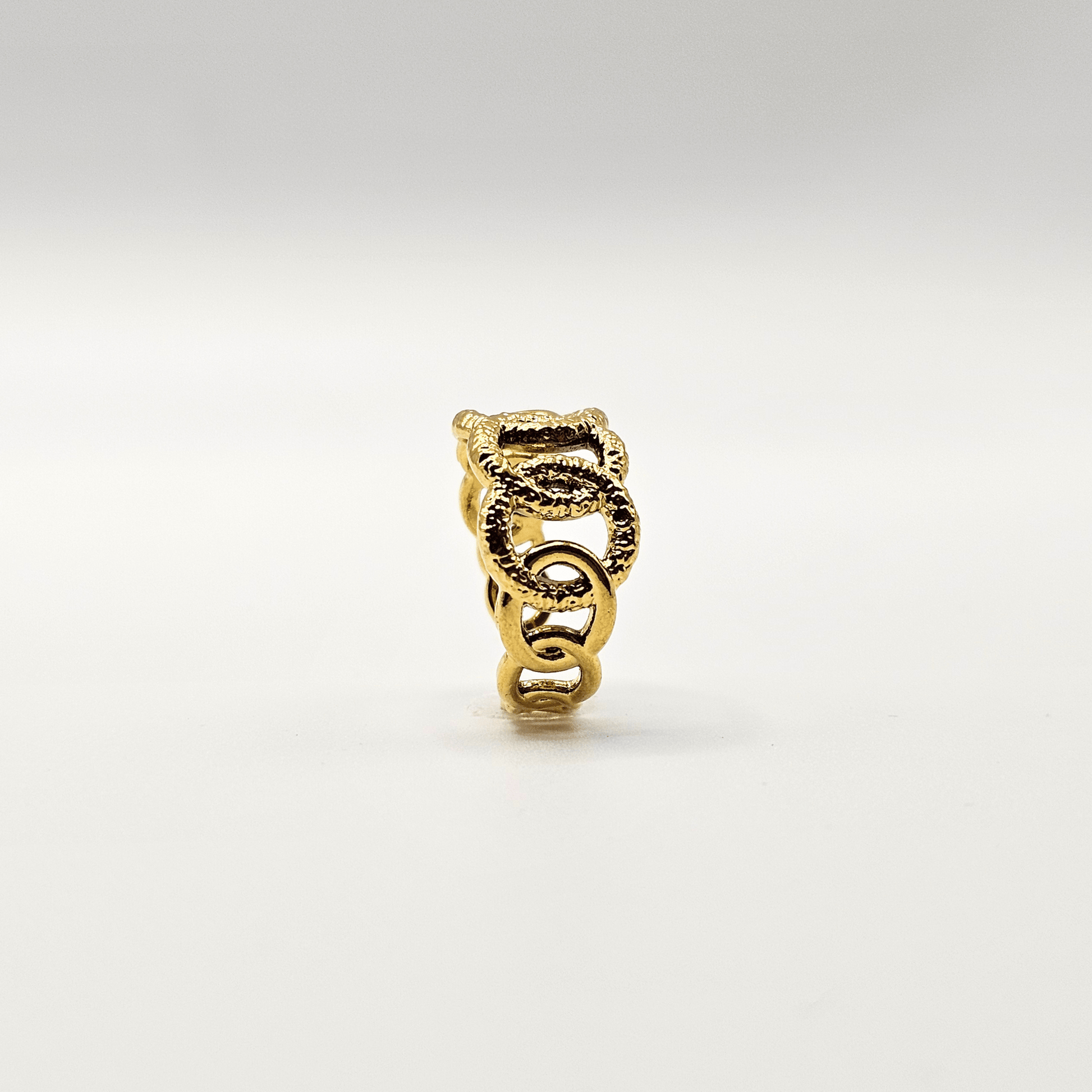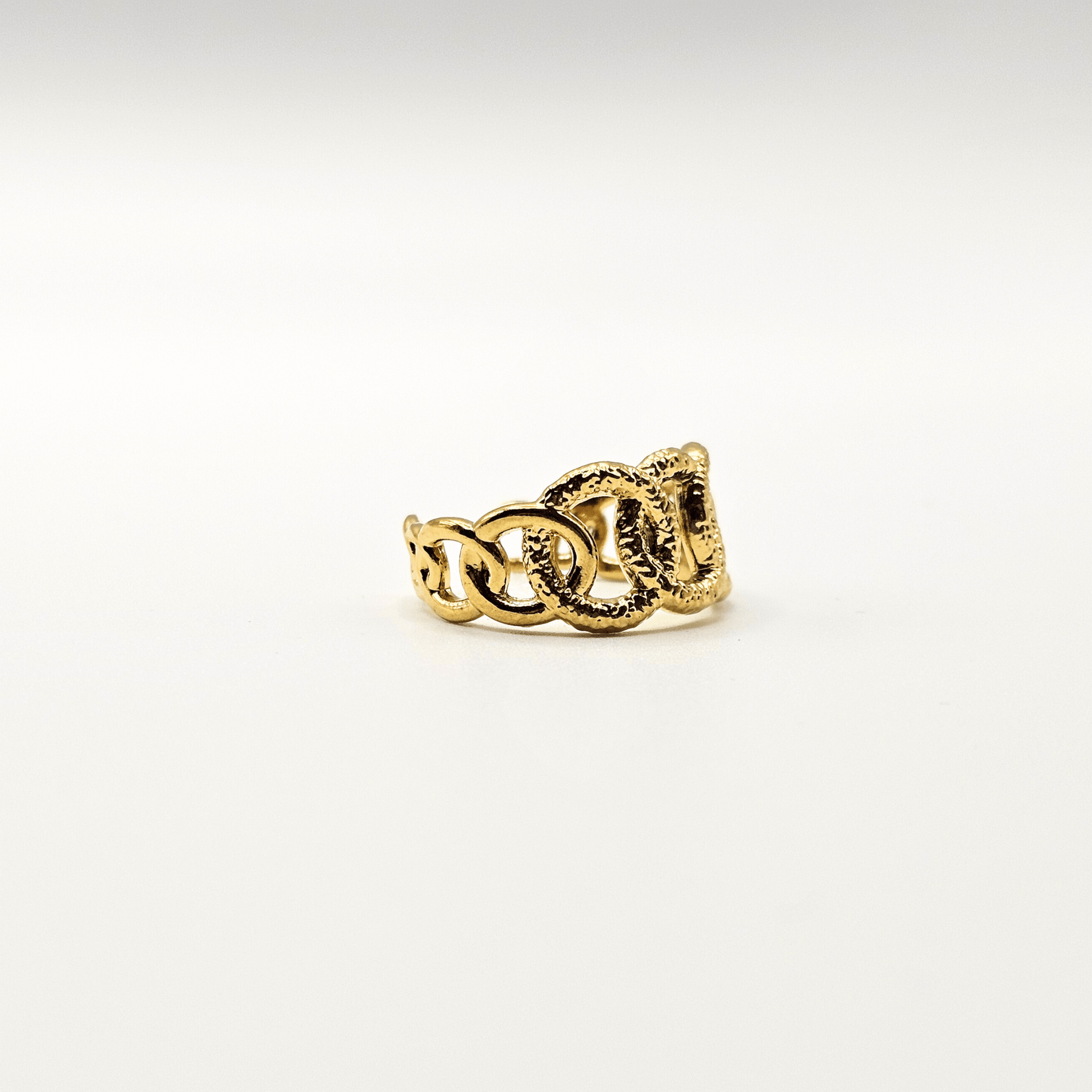 Elevate your everyday style with the Chivelle Aurora Textured Chain Ring from the Urban Luxe Collection. This bold statement gold ring features intricately textured chain links, expertly crafted in premium 18k gold-plated stainless steel for lasting beauty. Designed with a PVD coating, it is anti-tarnish, waterproof, and hypoallergenic—perfect for all-day wear without losing its shine. Whether worn solo for maximum impact or paired with minimalist bands, this versatile gold chain ring makes an effortlessly chic addition to any jewellery collection.