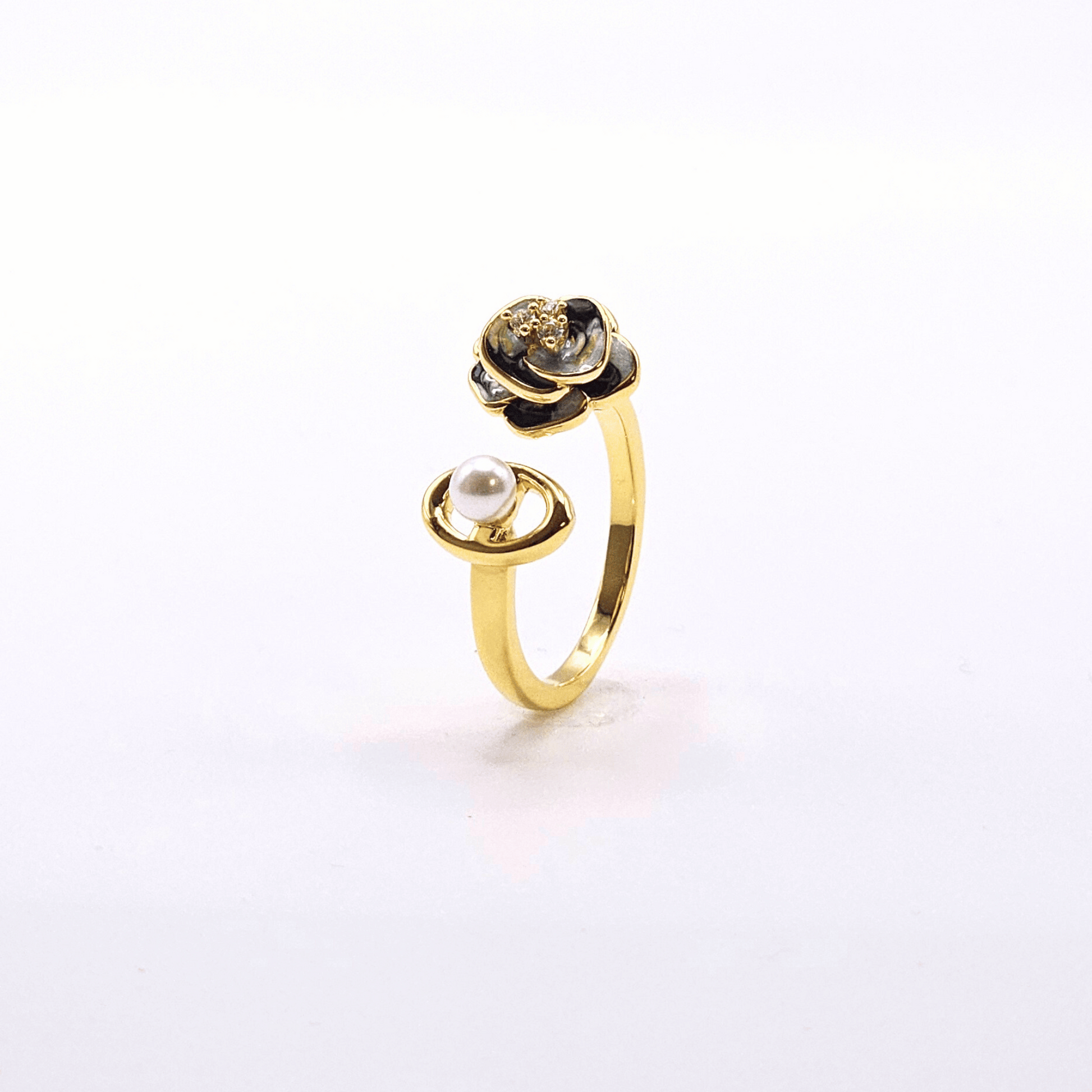 The Chivelle Bloom & Mother-of-Pearl Duo Gold Ring is a refined fusion of elegance and artistry. This fixed-size open-design ring features a delicate flower crafted with a shimmering mother-of-pearl inlay, accented by sparkling cubic zirconia, paired with a luminous faux pearl framed in gold on the opposite end. Made from premium stainless steel with 18k gold plating and PVD coating, it is waterproof, anti-tarnish, and skin-friendly. Perfect for adding a sophisticated glow to any outfit, from casual chic to evening glamour.