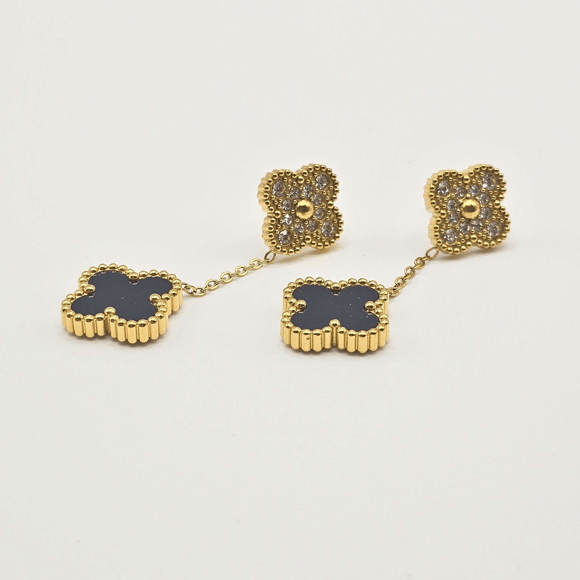 Elevate your look with the Chivelle Clover Drop Earrings from the Clover Collection. Crafted in stainless steel with 18k gold plating, these earrings feature a delicate clover motif accented with sparkling crystals on the stud and a dangling clover charm in black or white enamel. Elegant, minimal, and versatile, they are perfect for both day-to-night transitions.