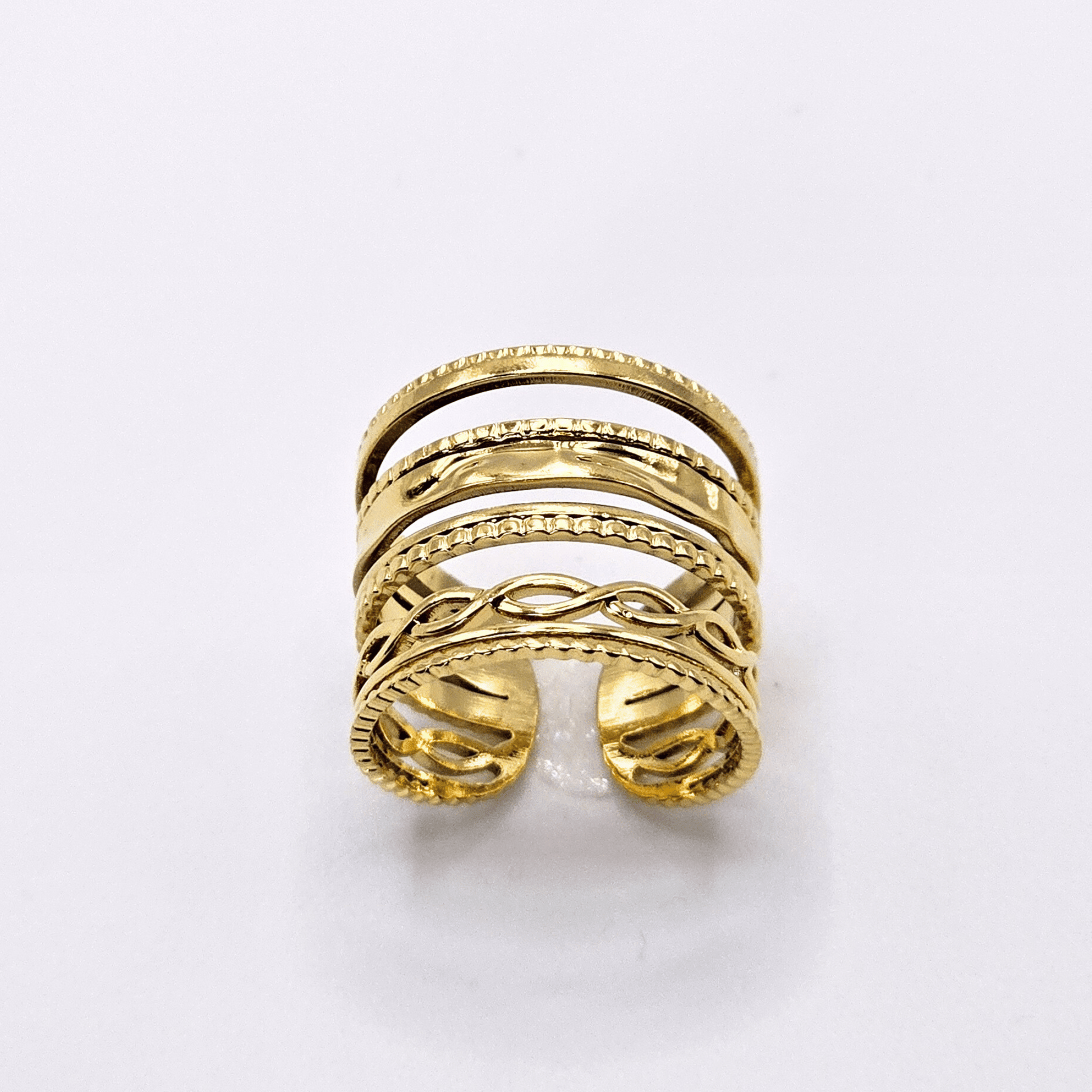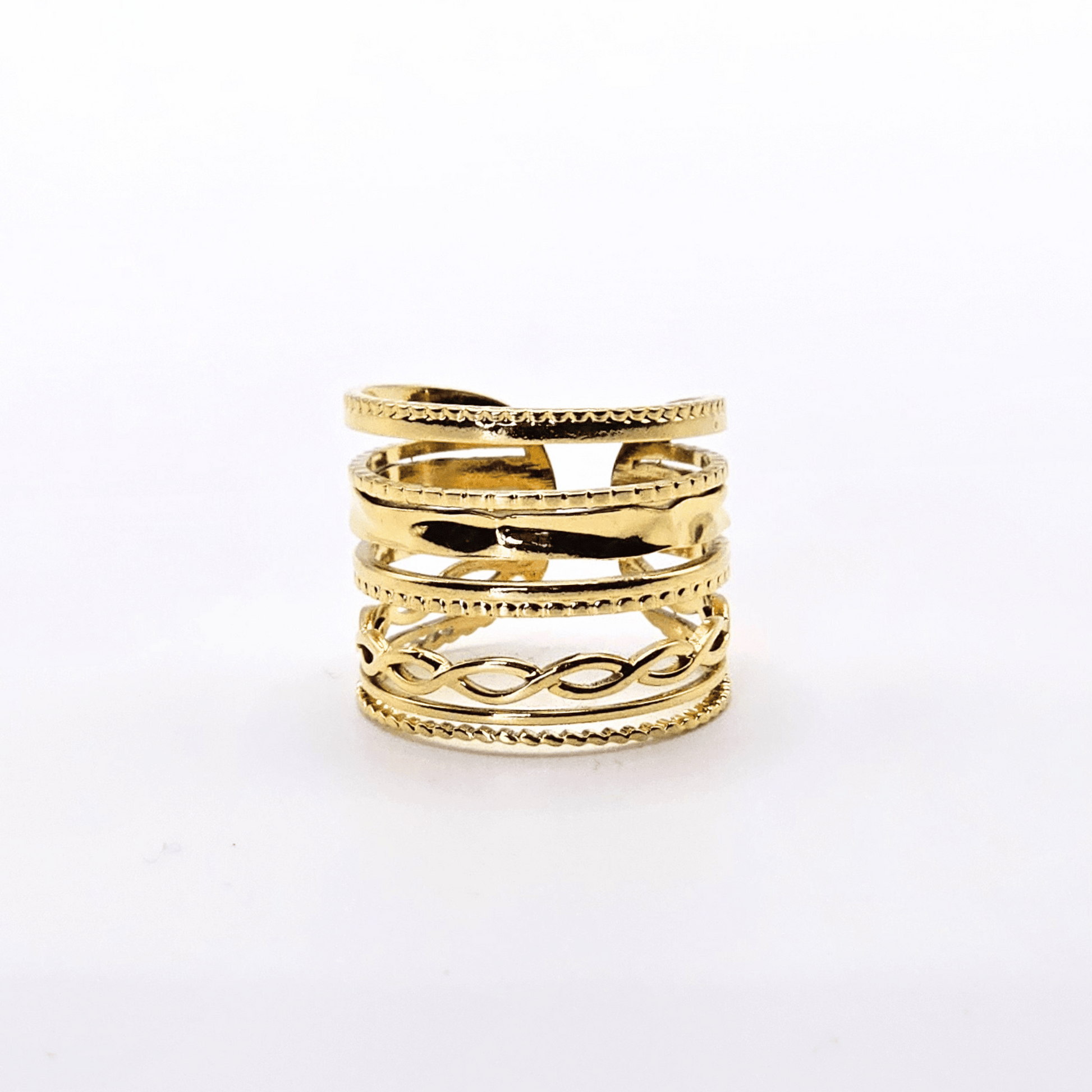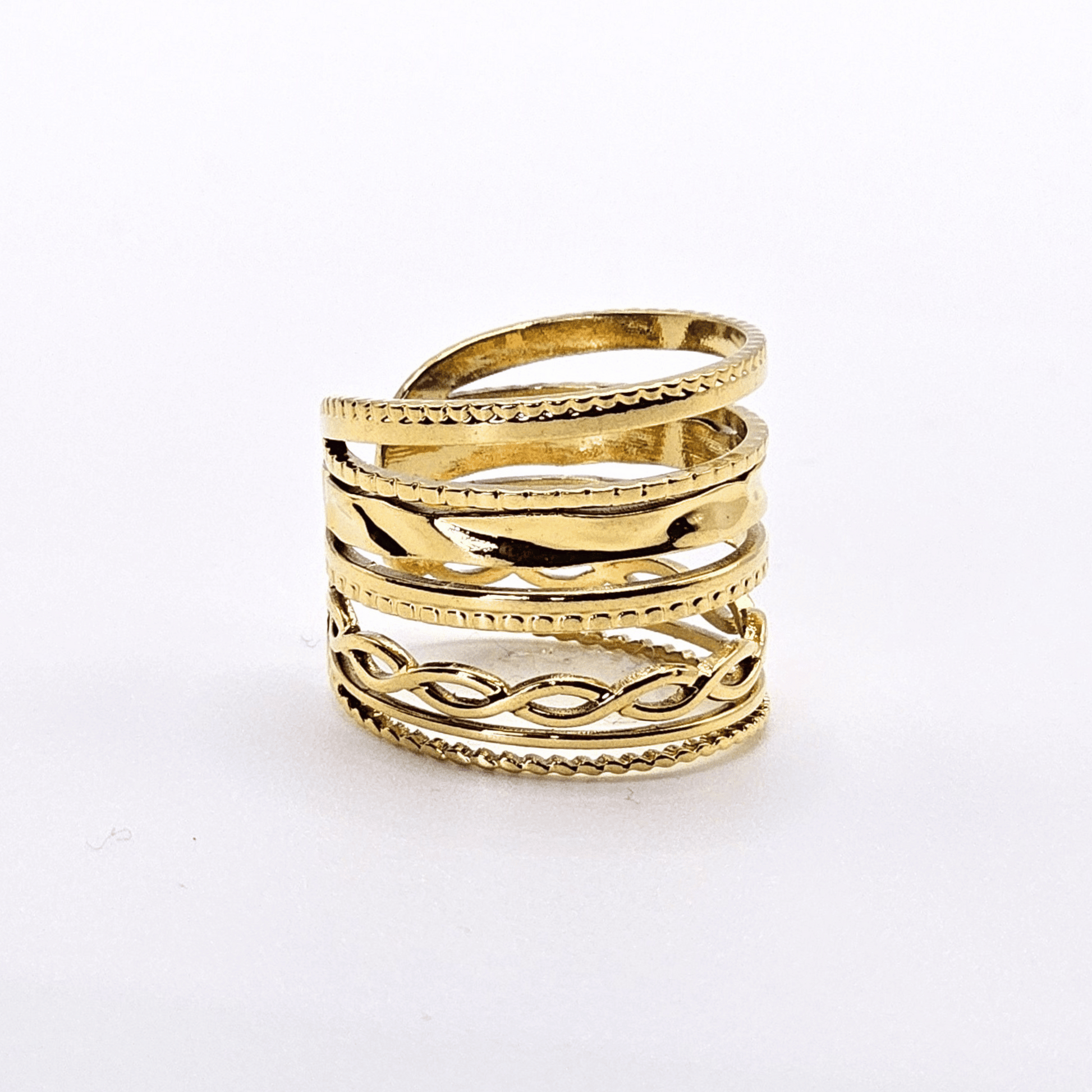 The Chivelle Gold Harmony Stackable Ring is the perfect blend of versatility and elegance. Crafted from premium stainless steel with 18k gold plating, this multi-band design features a mix of smooth, textured, and twisted patterns for a modern, layered look. Designed to be worn solo for a minimalist statement or stacked with other favourites, this ring is lightweight, adjustable, and skin-friendly — perfect for all-day wear. A timeless addition to your jewellery wardrobe.