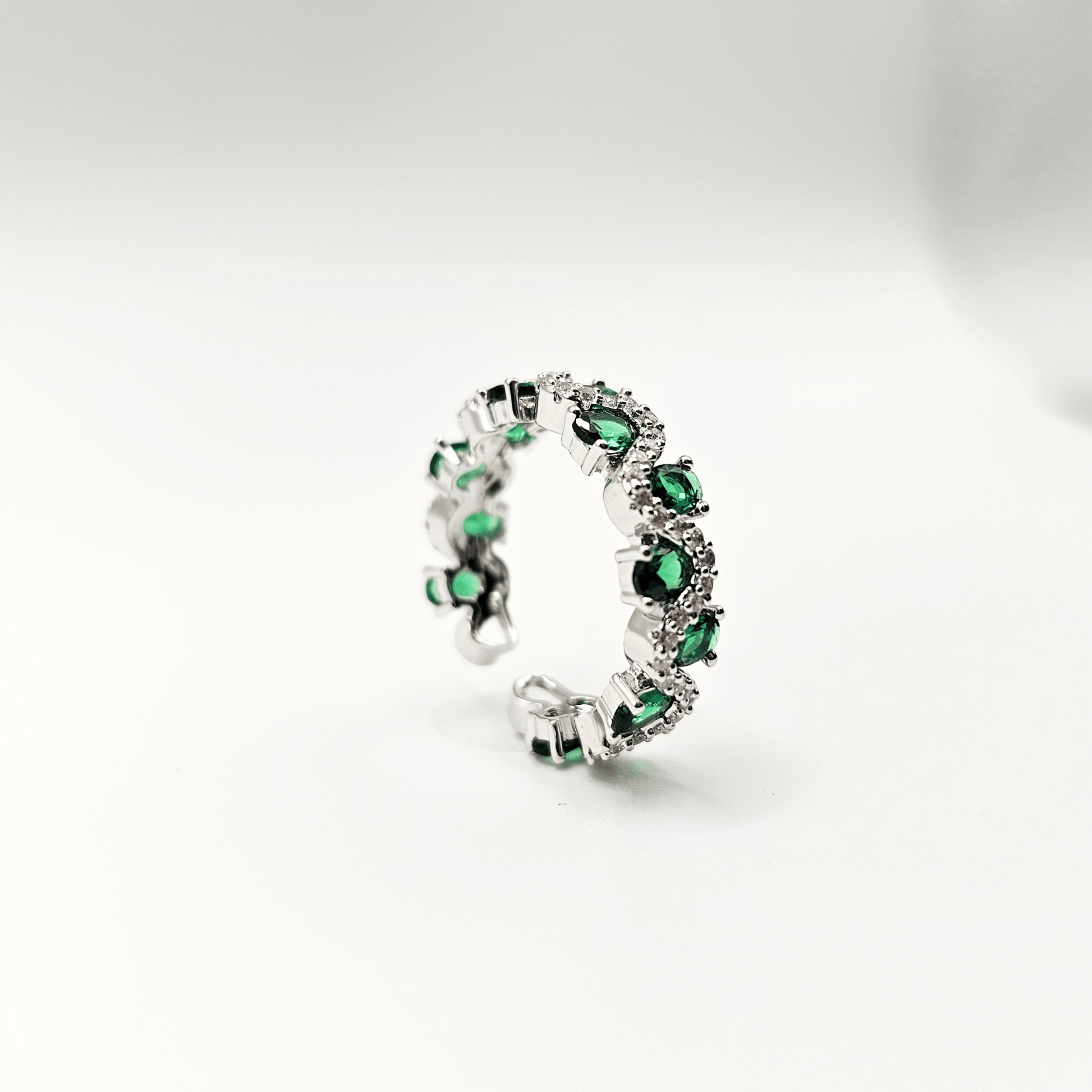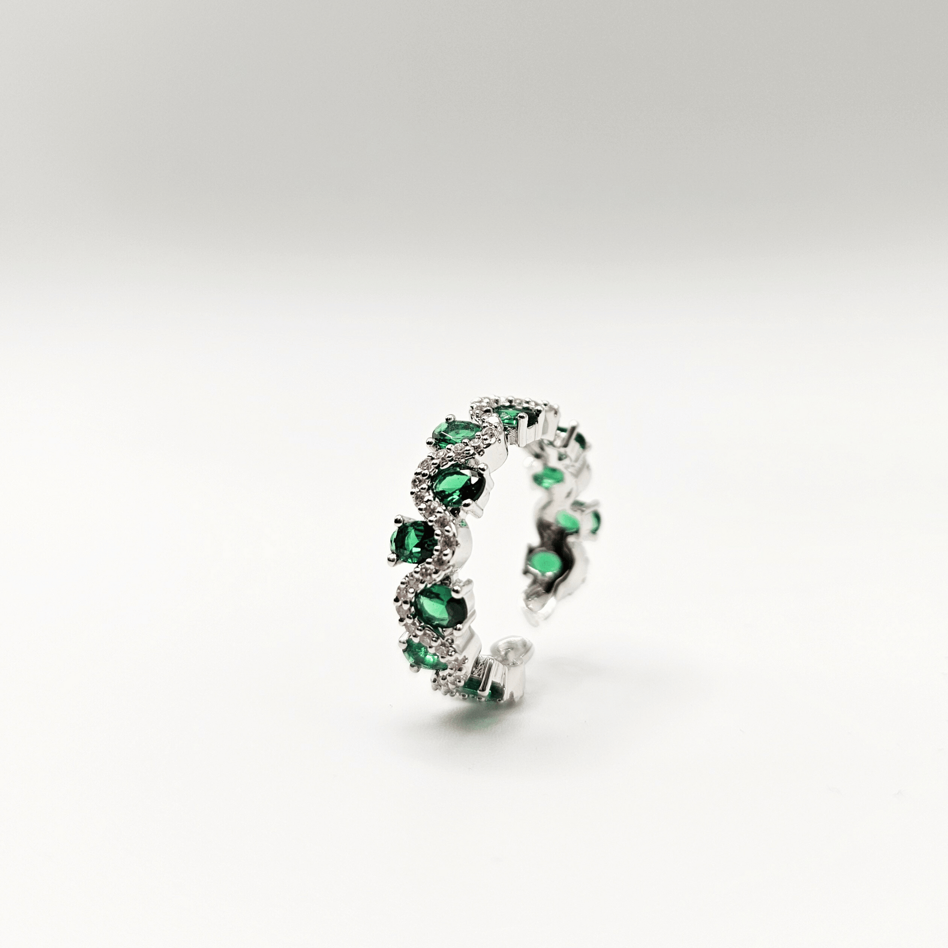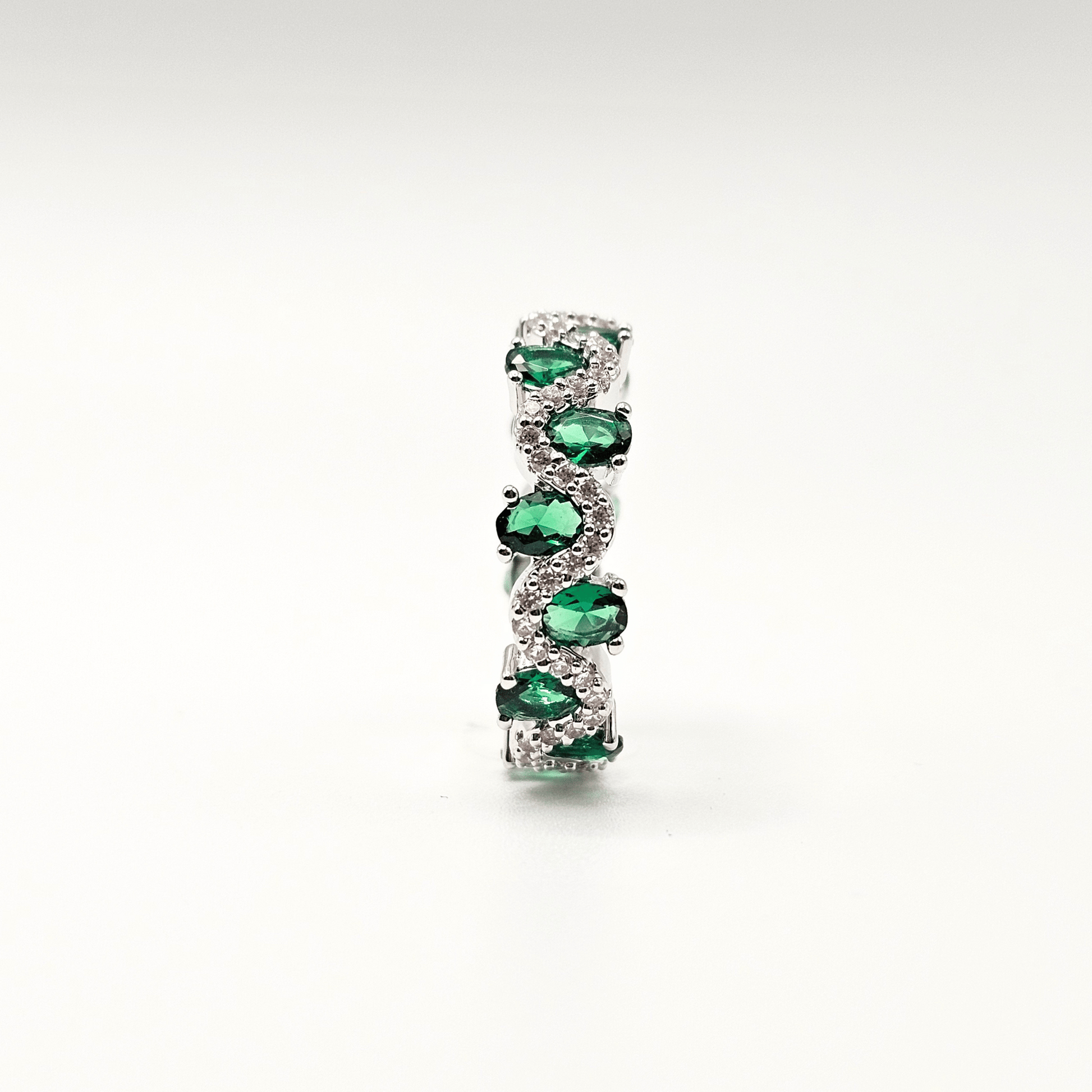 - Design: Wave-inspired eternity band with alternating emerald-green and white stones
