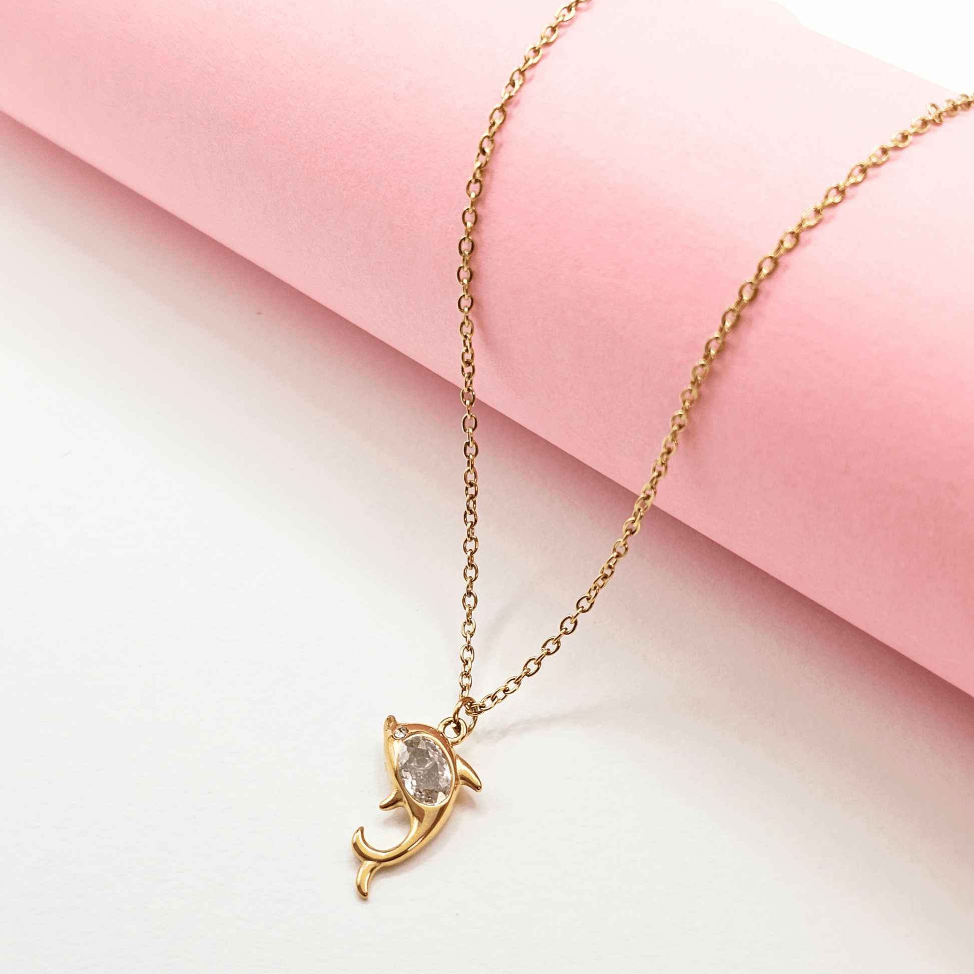 The Chivelle Ocean Grace Dolphin Pendant Necklace from our Everyday Collection blends playful charm with timeless elegance. Crafted in PVD-coated, 18k gold-plated stainless steel, this waterproof, tarnish-resistant, and hypoallergenic piece features a sleek dolphin design with a sparkling marquise-cut crystal. Perfect for layering or wearing solo, it’s a versatile accessory for any ocean lover.