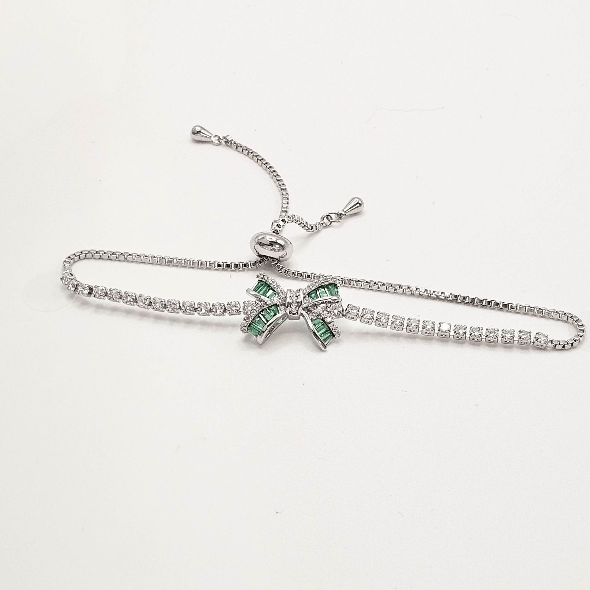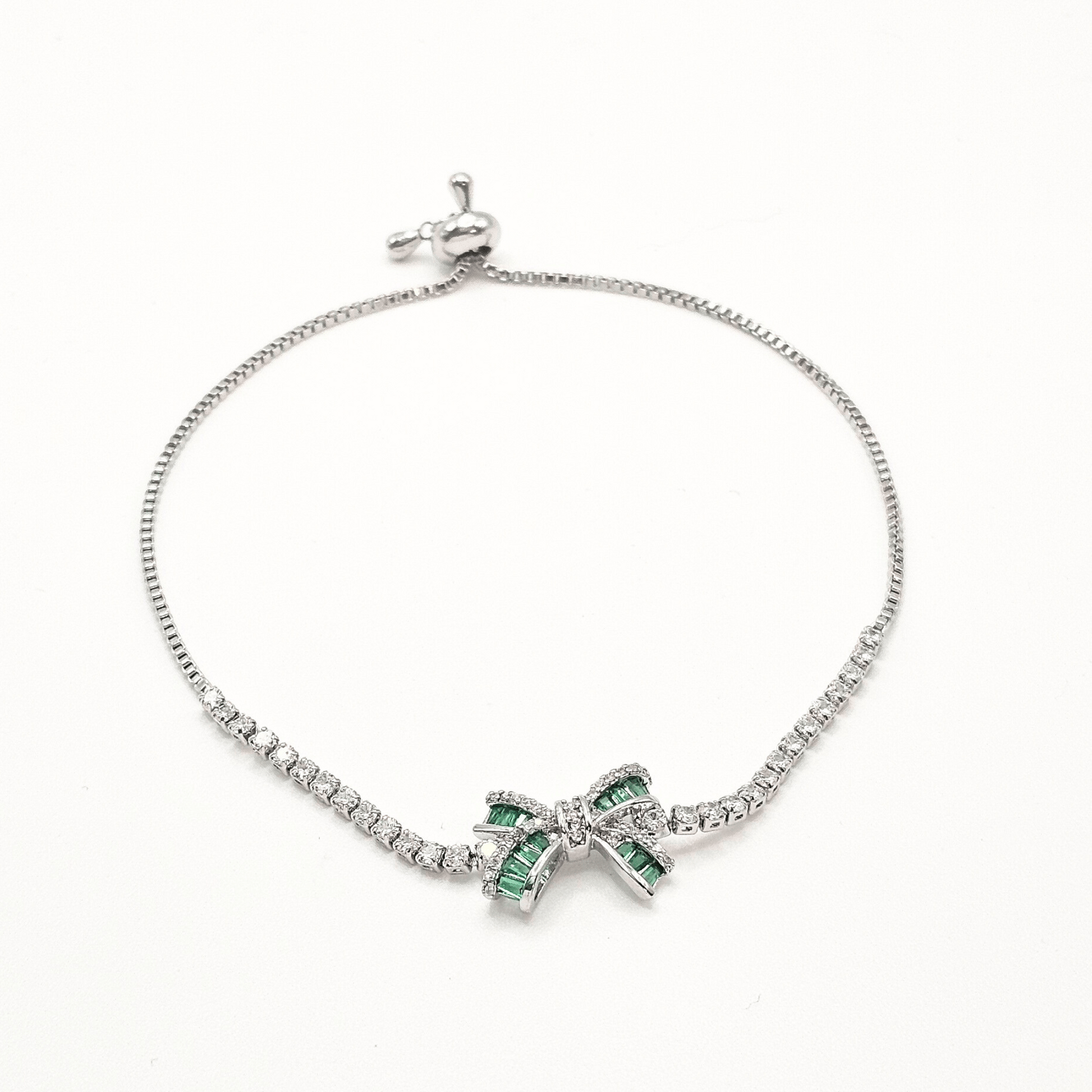 Delicate yet eye-catching, the Chivelle Emerald Bow Adjustable Bracelet adds a touch of playful sophistication to your jewellery collection. Featuring a finely detailed bow motif accented with baguette-cut emerald green stones and shimmering white pavé stones, this bracelet offers the perfect balance between elegance and charm.