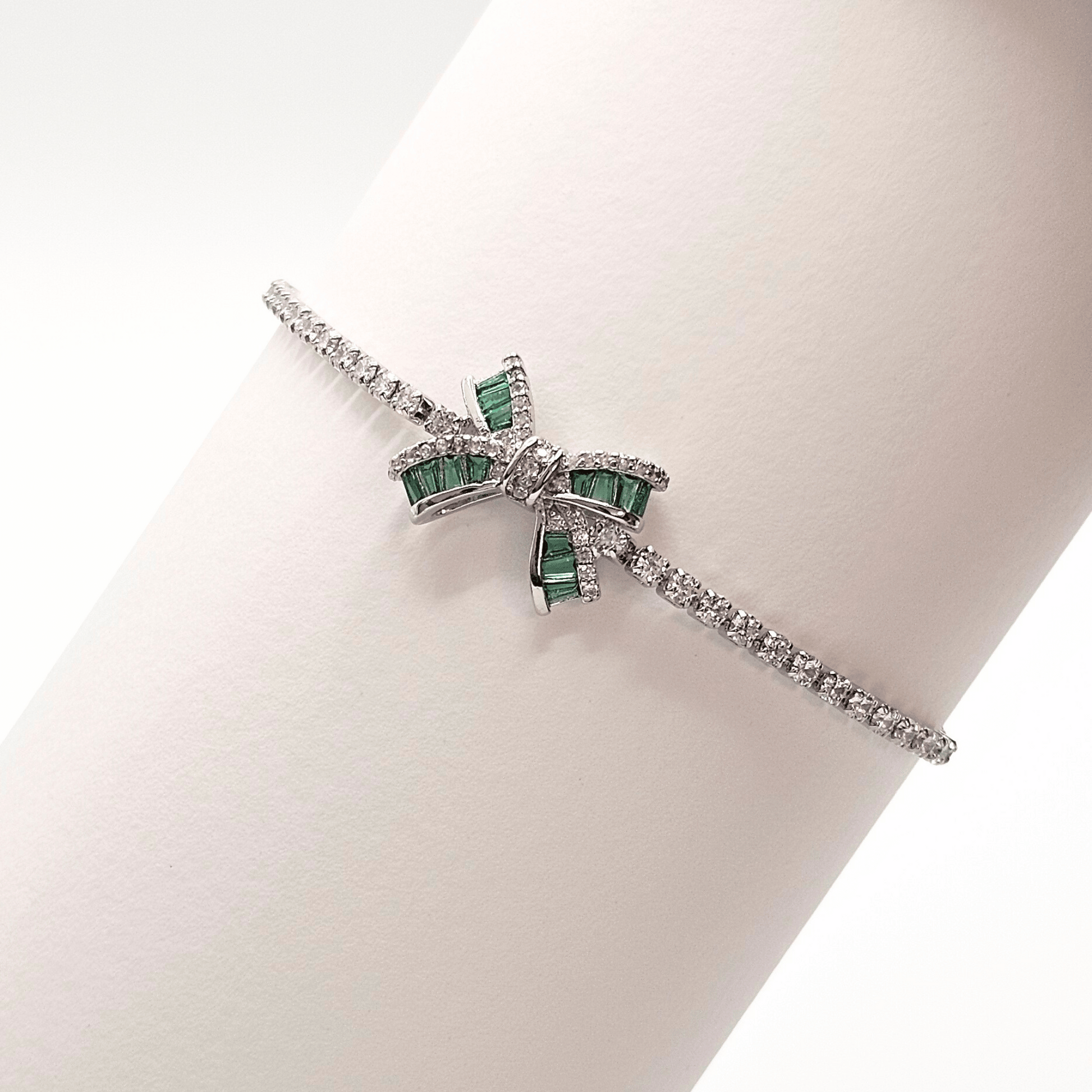 - Design: Bow motif with baguette-cut emerald green and pavé white stones