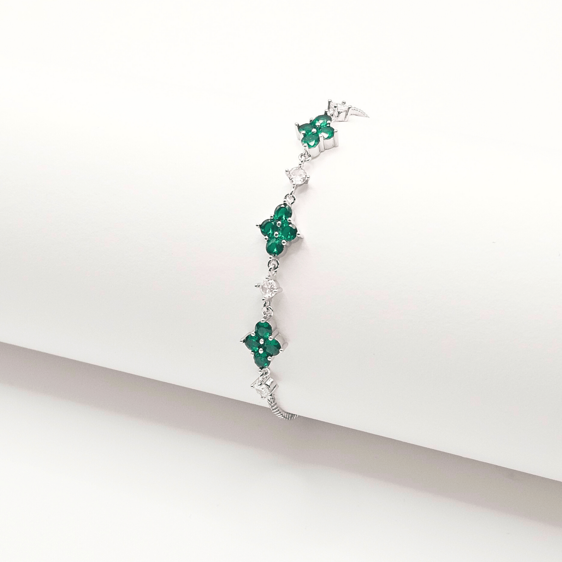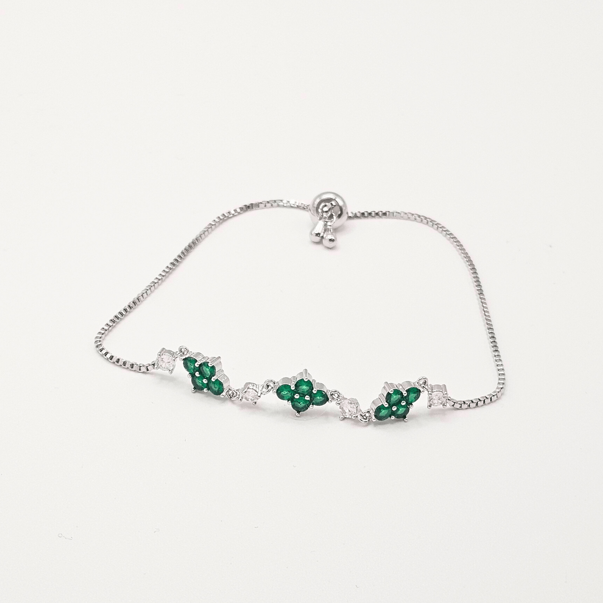 Add a fresh pop of colour to your jewellery collection with the Chivelle Emerald-Green Clover Adjustable Bracelet. Featuring dainty clover motifs set with vibrant emerald-green stones and sparkling white accents, this design captures a blend of playful charm and refined elegance.