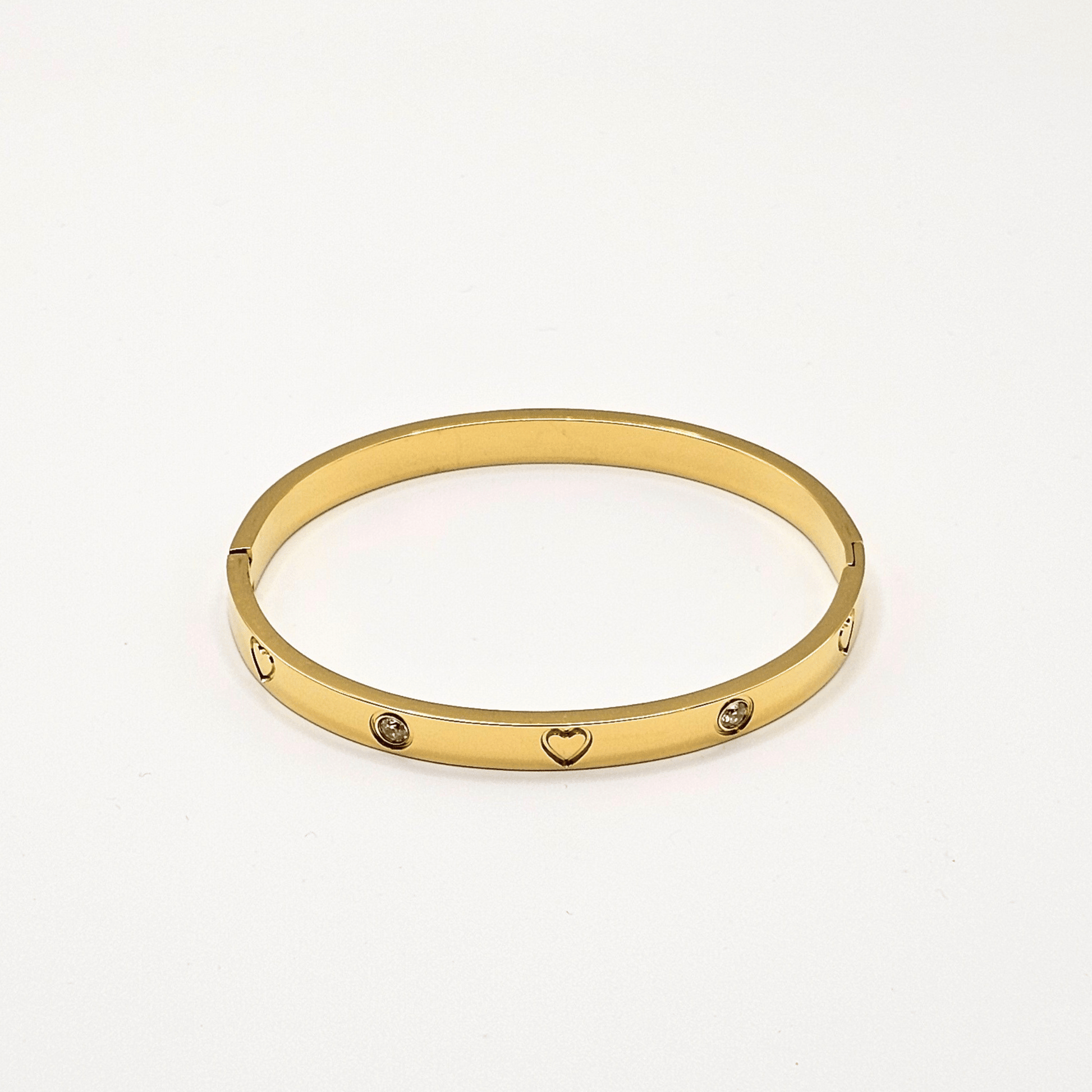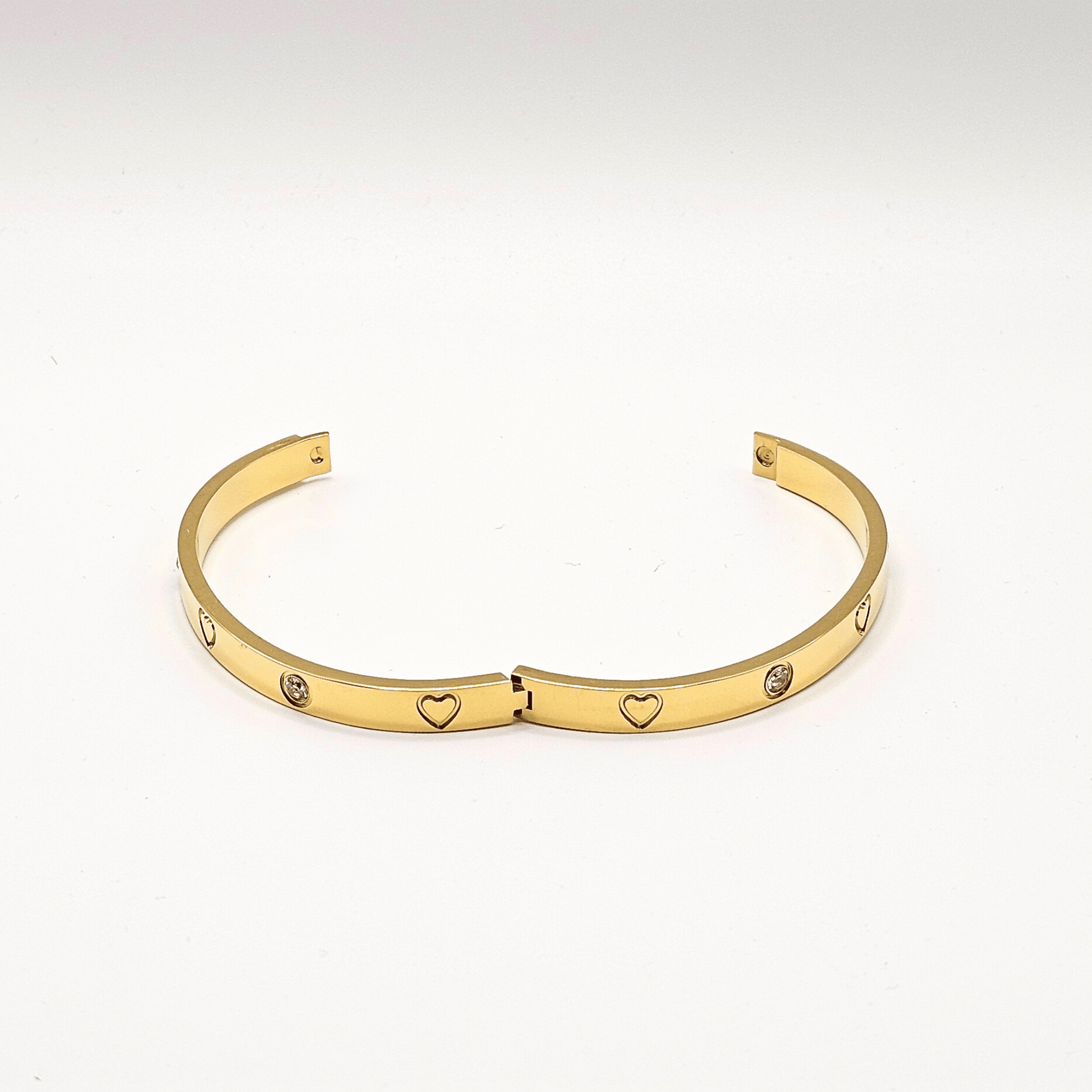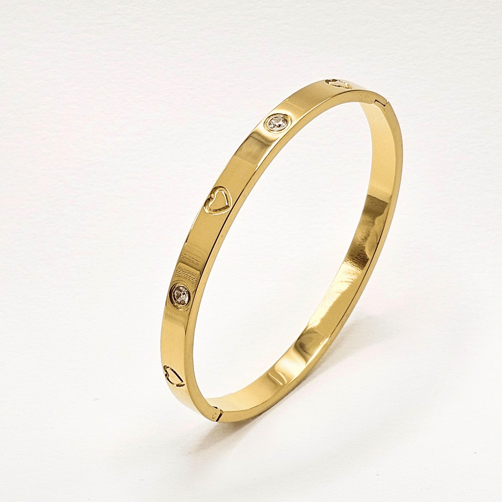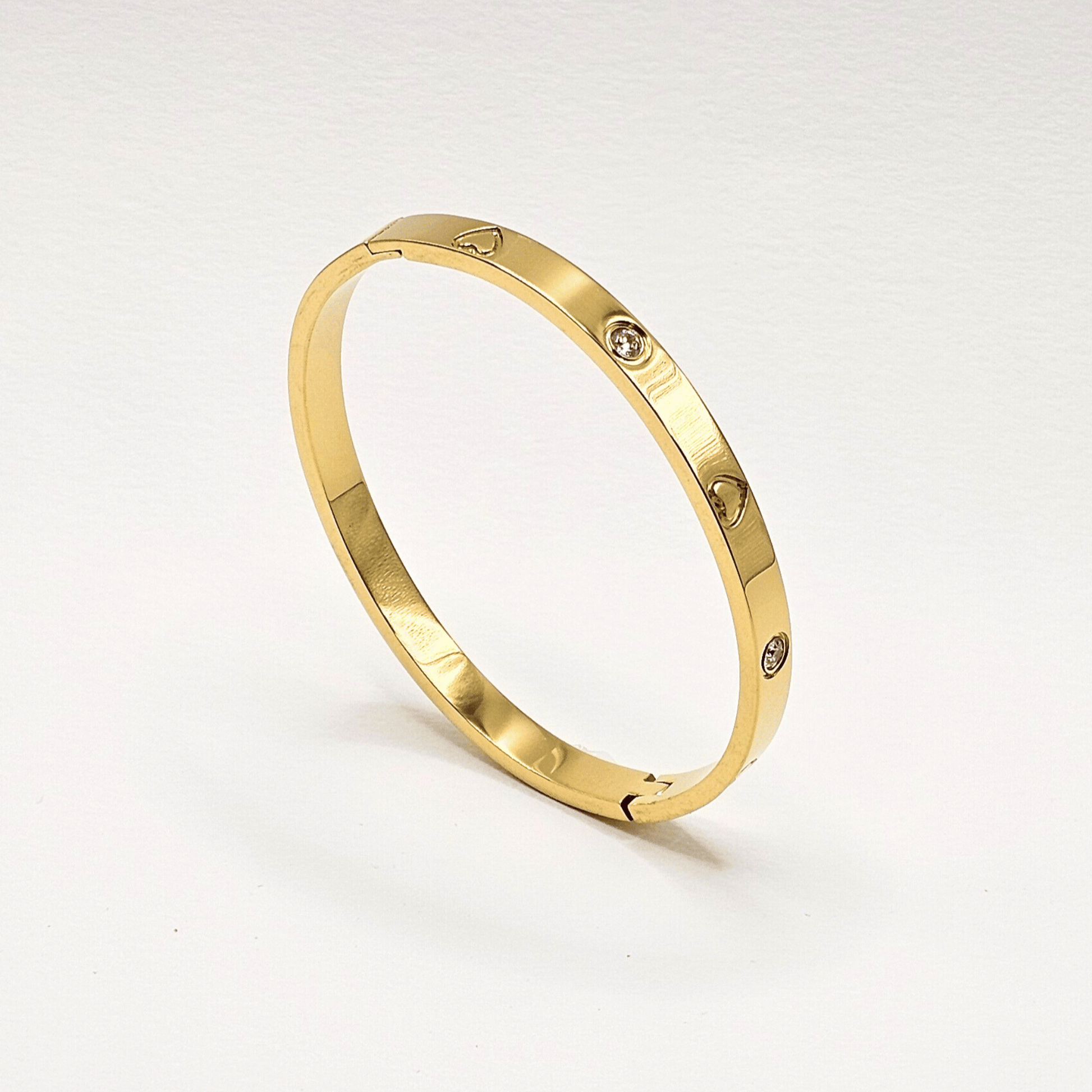 Elevate your everyday look with the Chivelle Heartstone Hinged Bangle, a sleek and romantic accessory featuring engraved heart motifs and dazzling white stones. Crafted from premium stainless steel with a durable 18k gold plated finish, this bangle combines elegance with lasting shine.