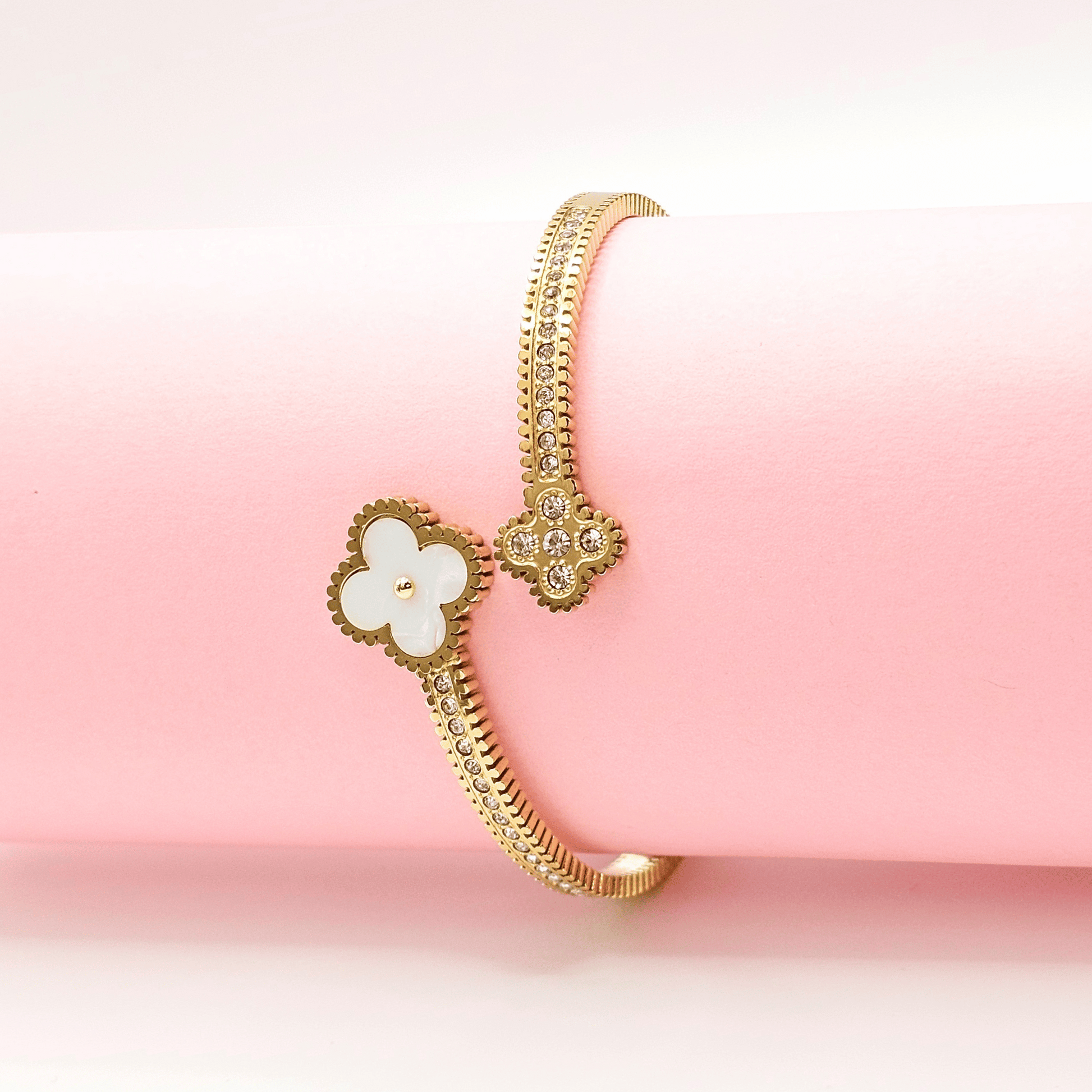 - Design: Elegant double clover motif – one in luminous mother of pearl, the other adorned with sparkling crystals.
