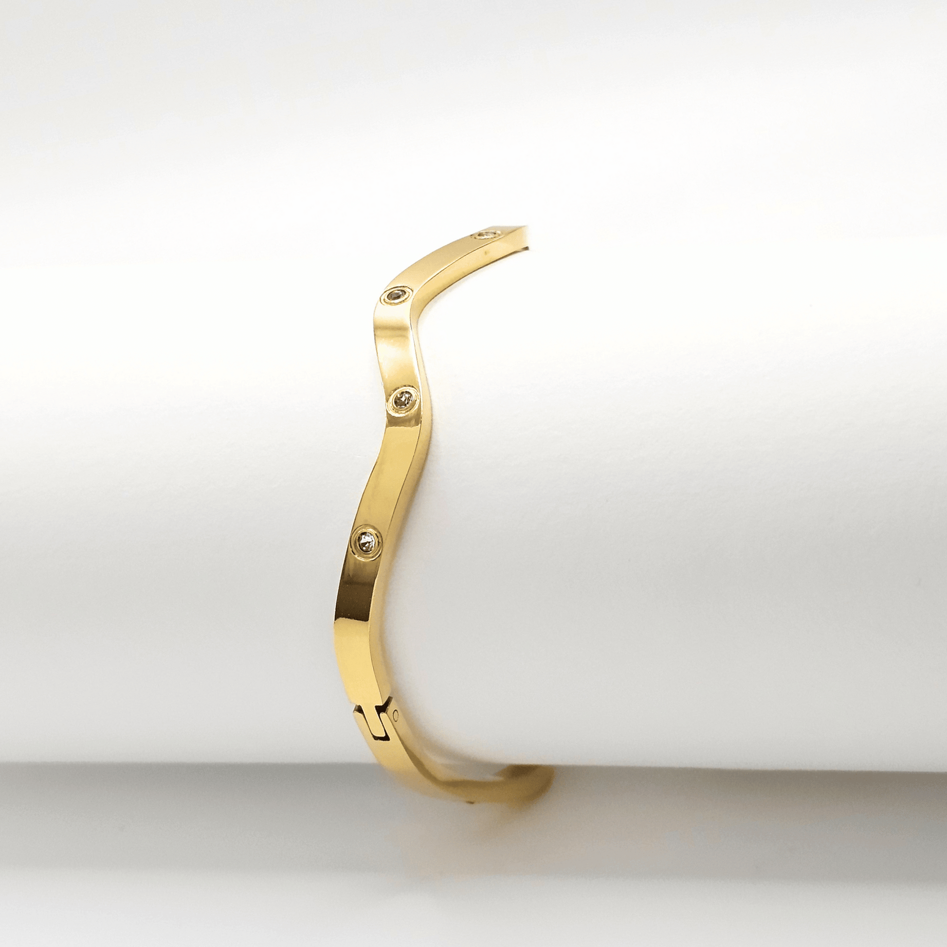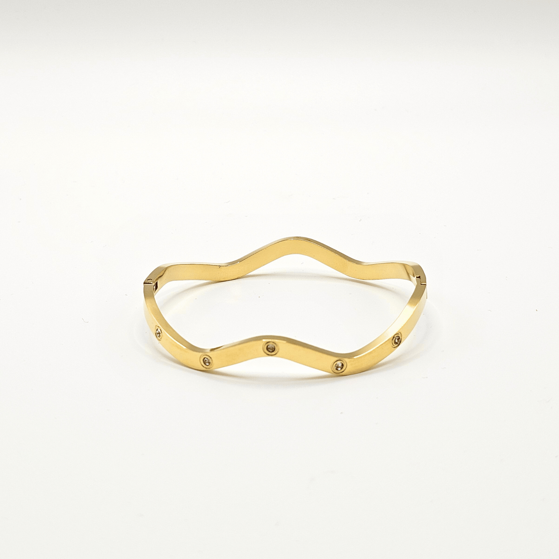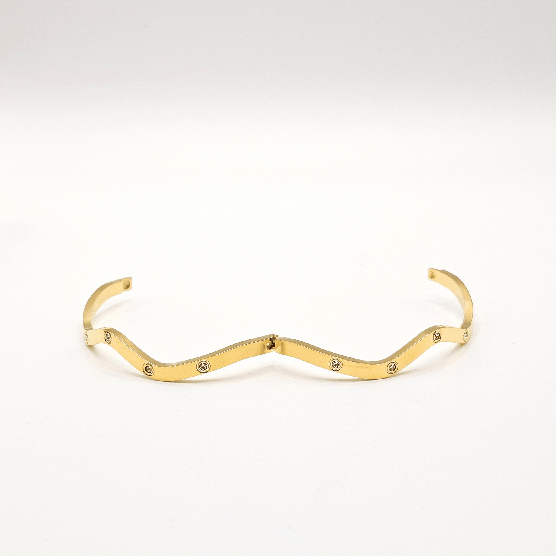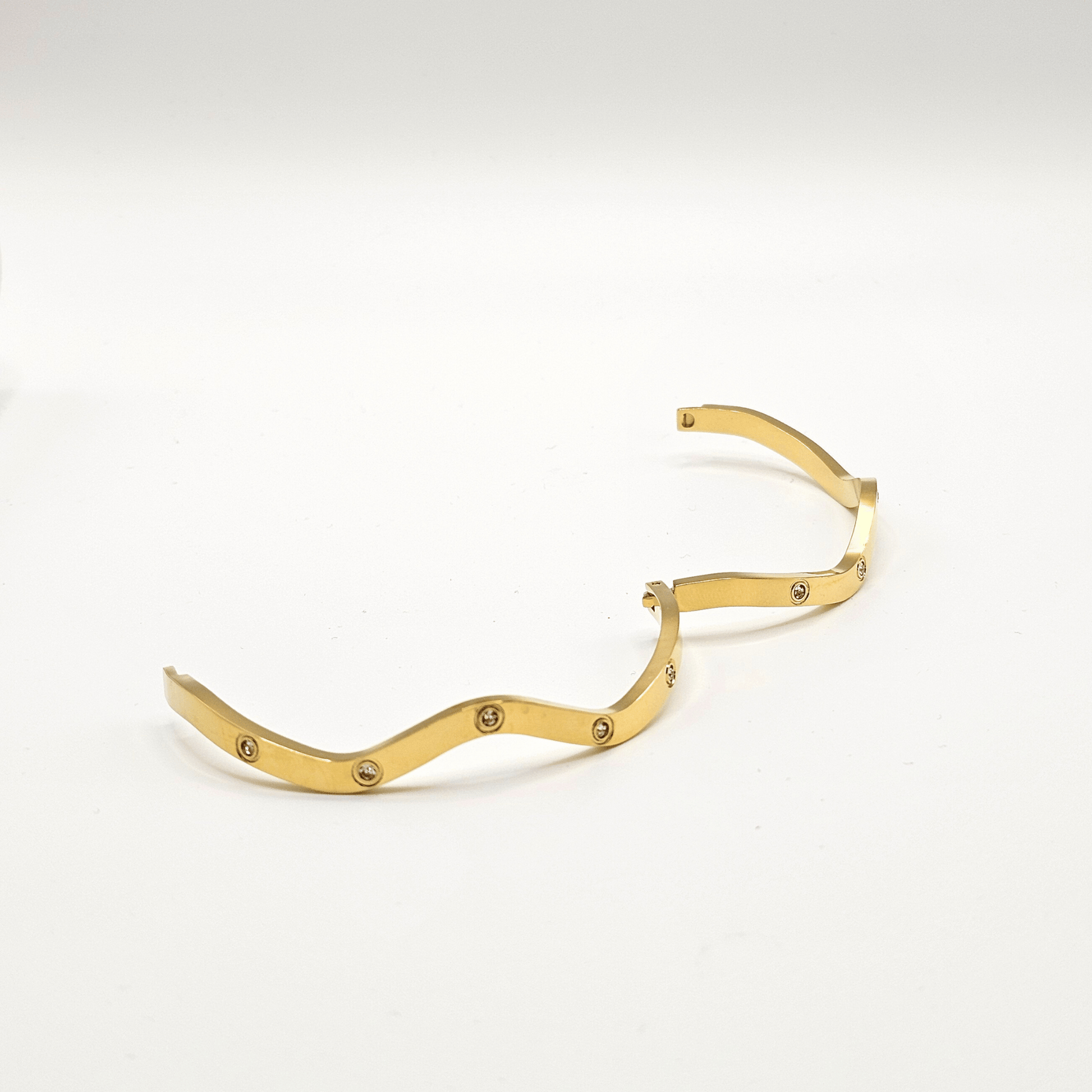 A modern twist on elegance, the Chivelle Ondulé Wave Crystal Cuff Bangle showcases fluid wave-like curves accented with precision-set crystals. Crafted from premium stainless steel and plated in luxurious 18k gold, this cuff blends contemporary minimalism with timeless sophistication. Its open design ensures a comfortable fit while making a bold style statement. Perfect for both day-to-night wear, it’s a versatile piece that elevates any look.